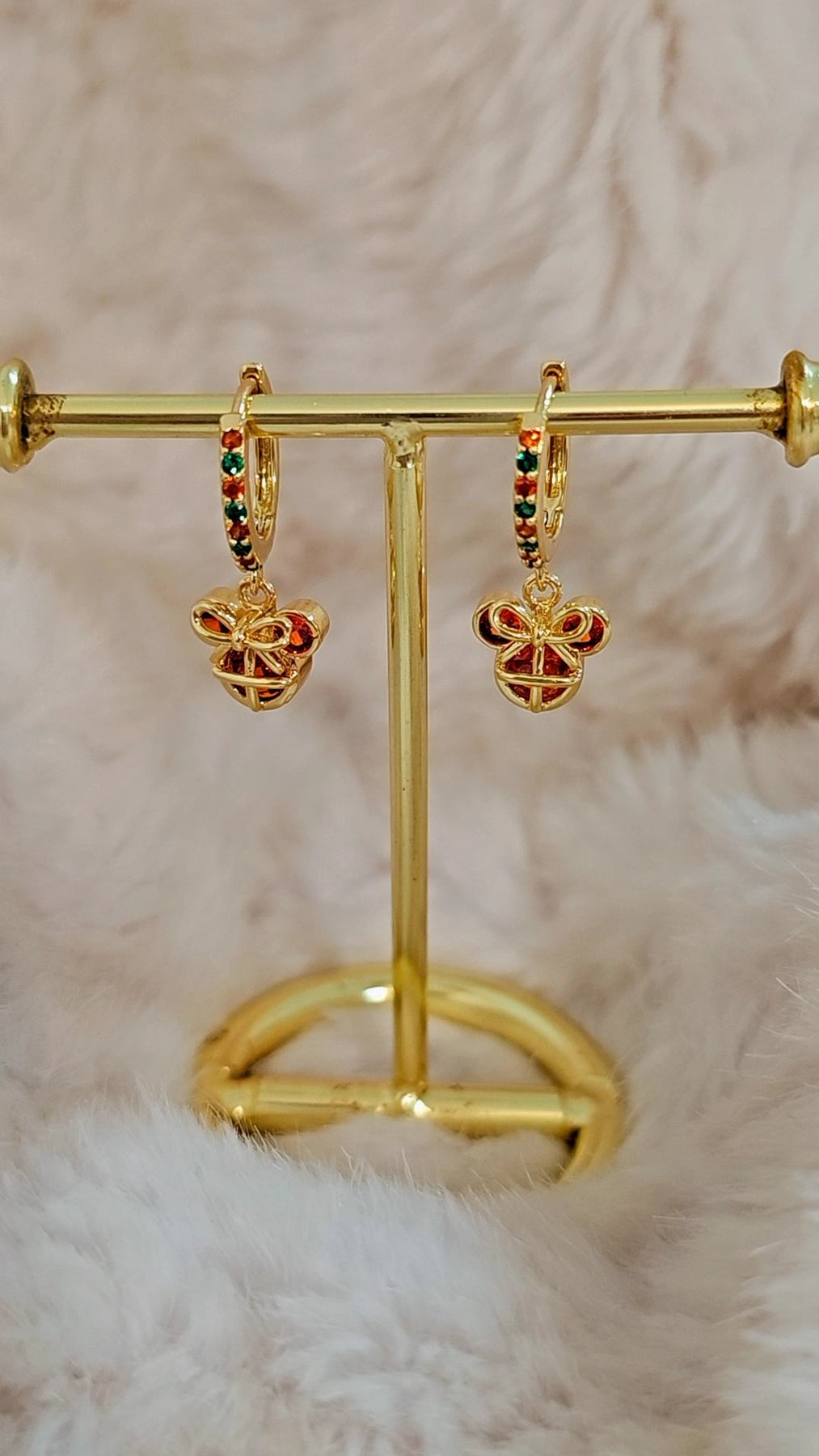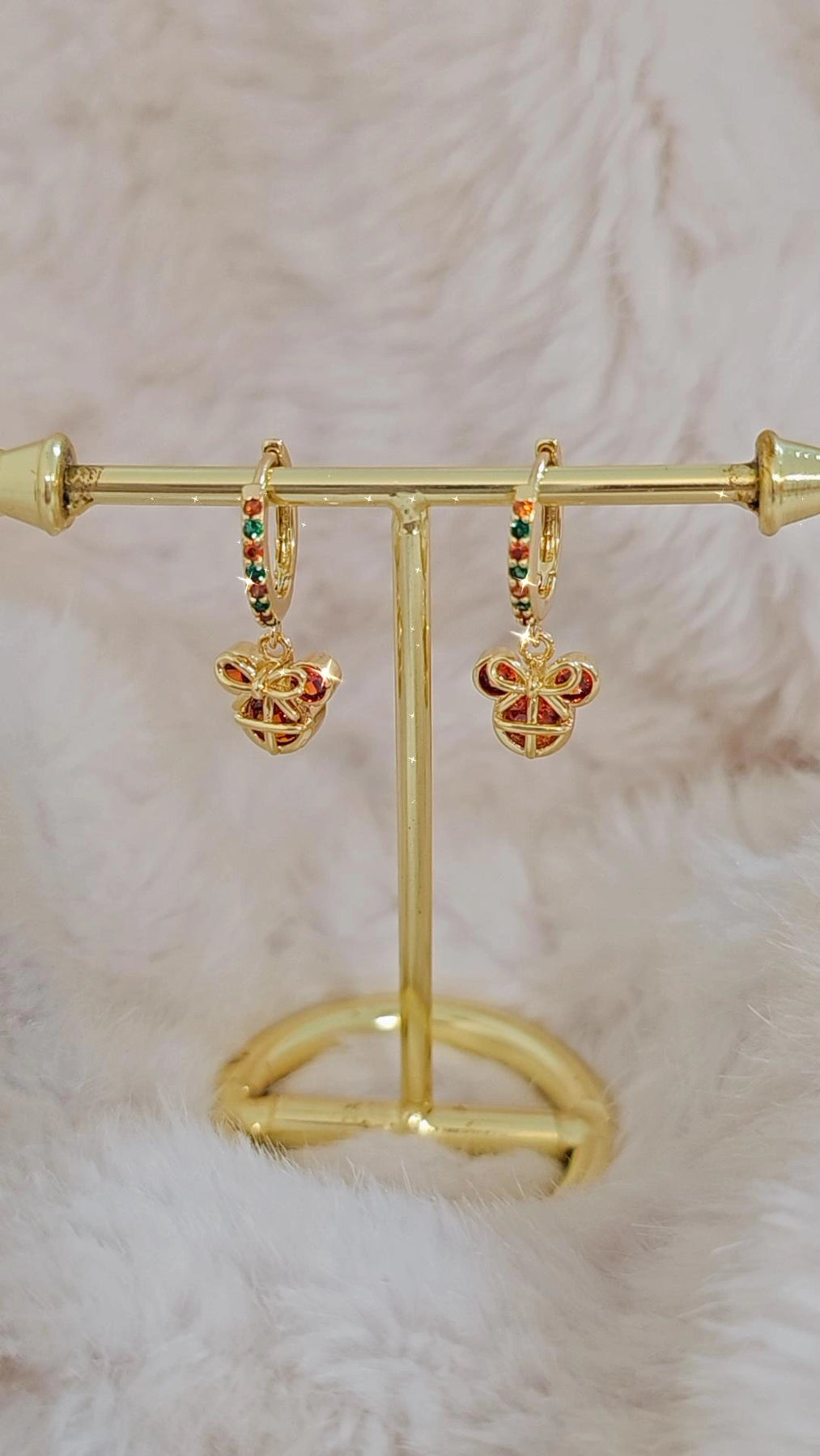 Description & DetailsFeature: minnie with a bow in a Holiday Earrings.Material: brass, pavé multi color CZ.